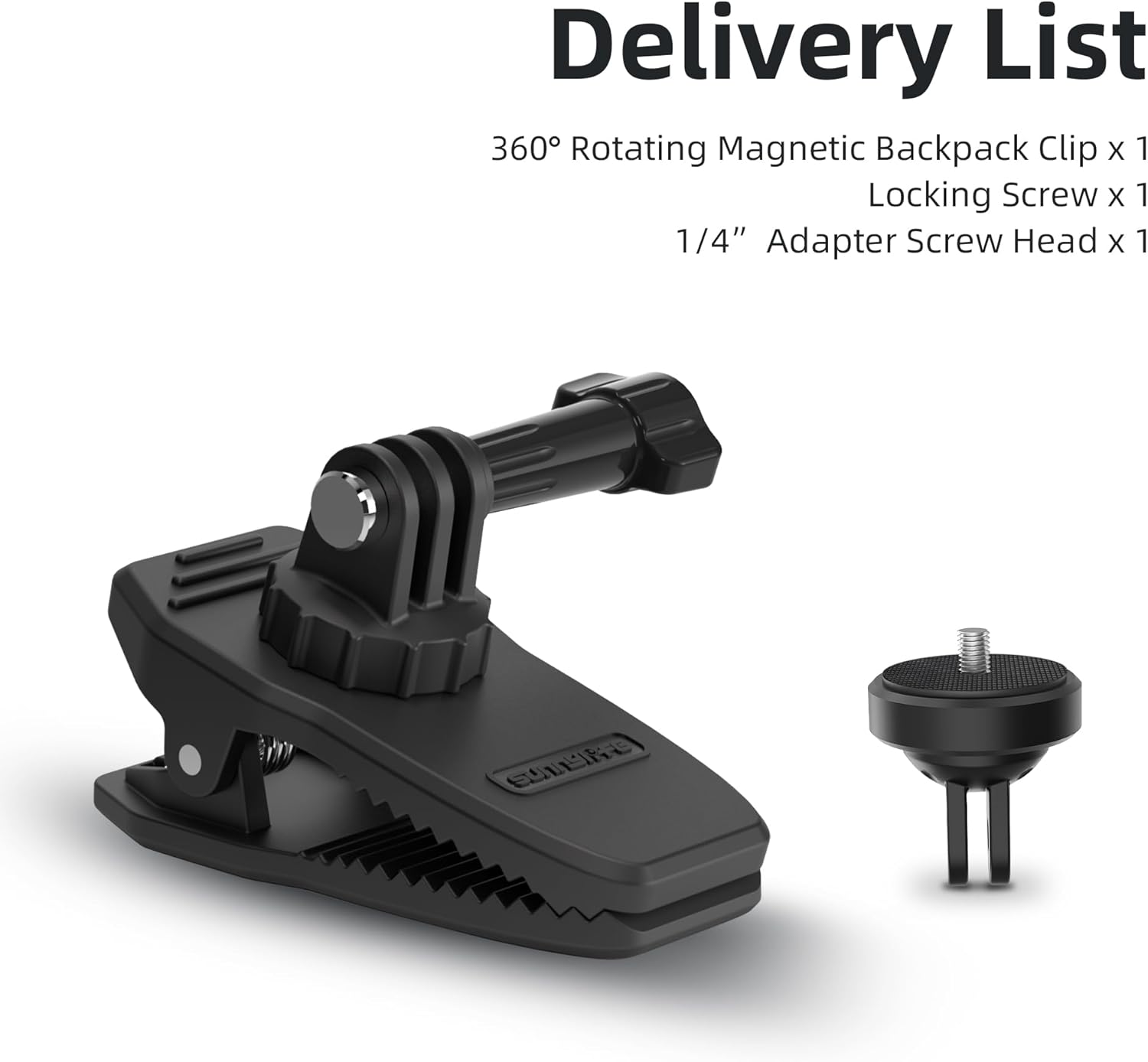 【Package Includes】 1× 360° Rotating Magnetic Backpack Clip, 1× Locking Screw, 1× 1/4” Adapter Screw Head.