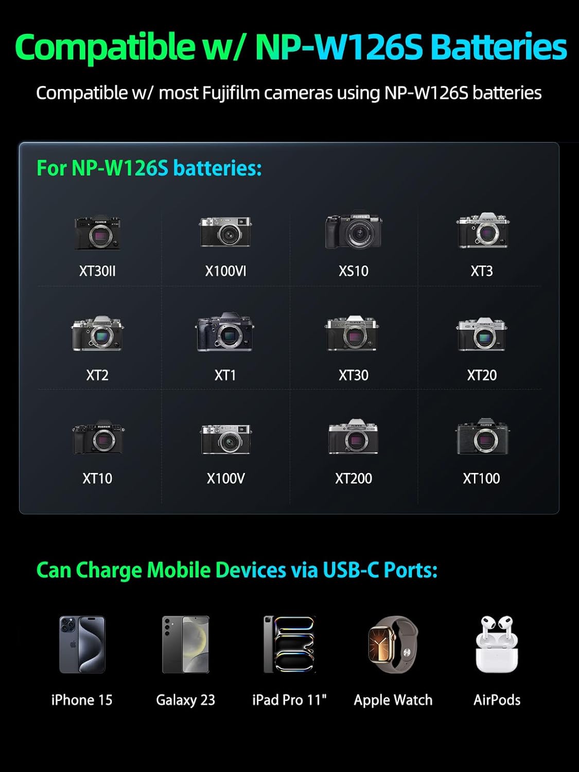 WIDE COMPATIBILITY & MULTI-DEVICE SUPPORT Engineered for Fujifilm XT30II X100VI X-M5 XS10 XT3 XT2 XT1 XT30 XT20 XT10 X100V XT200 XT100 X100F XA7 XE3 Xpro3 Xpro2 Xpro1 XE1 XE2 XE2S XM1 XA3 XA5 XA10 XH1, and more. Beyond cameras, this wireless battery charger for NP-W126S batteries can also charge for iPhone 16, iPad Pro, Samsung Galaxy S25, and other USB-C devices—truly an all-in-one charging solution.