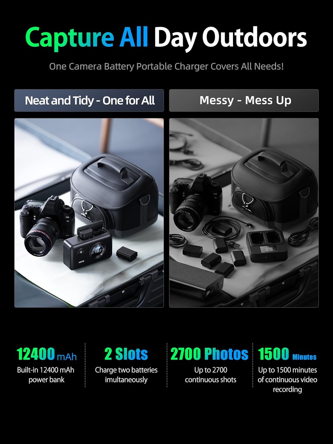 2-IN-1 POWER BANK & CHARGER: Stay Powered Anytime, Anywhere Combining a 12400mAh built-in battery and high-speed dual charging, this fast battery charger functions as both a portable power bank and dual-slot charger. No wall outlet? No problem. Charge on the go, while hiking, traveling, or during field shoots—your X-Series camera stays ready.