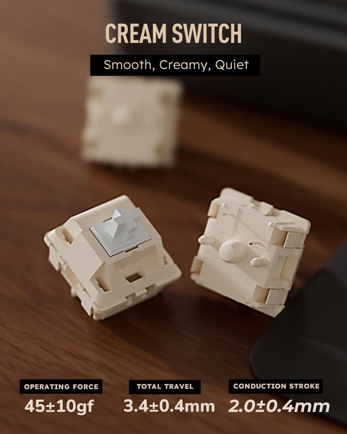 【Pre-lubed Cream Switches & PBT Keycaps】:Designed for a seamless typing experience, this linear switch provides a smooth, consistent keystroke with a distinct creamy sound signature. Perfect for both gaming and prolonged typing sessions. Paired with durable PBT keycaps that resist shine and wear, this keyboard offers a stable typing experience. This silent mechanical keyboard is ideal for office environments.