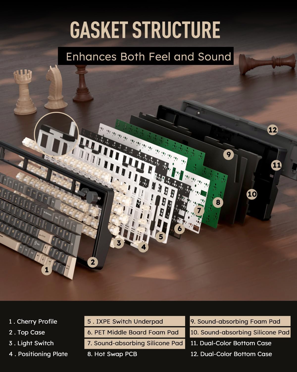 【Gasket Mount Structure for Enhanced Gameplay】: Features a gasket mount design with extended silicone padding, PCB single-key slotting, and 5-layer sound-dampening. This setup absorbs keystroke impact for a deeply thocky sound and consistent tactile responsiveness. The keys are easy to press and have much less fatigue. Built with a solid structure that stays firmly in place, it ensures stable and precise control for rapid triggers during extended gameplay.