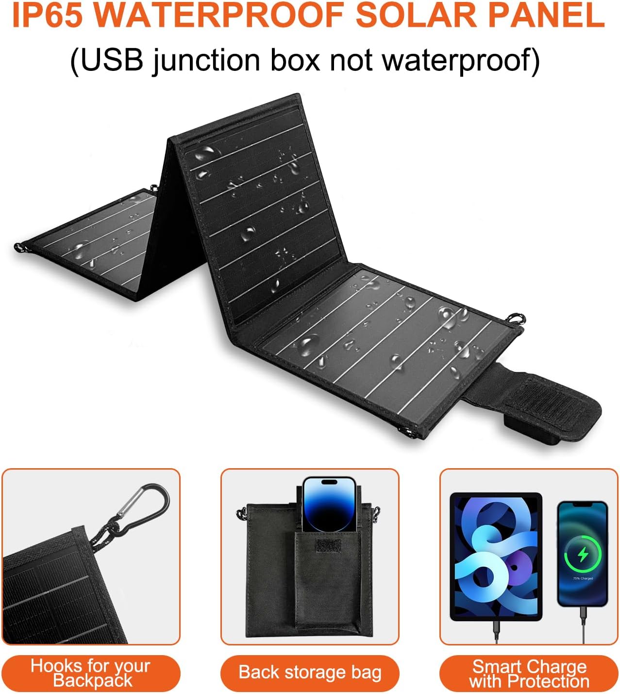 IP65 WATERPROOF & DUSTPROOF:The backpacking solar panel is IP65 waterproof and dustproof, which is better preparedfor occasional bad weather or unexpected conditions. If stained, just wipe the solar panels gently with a wet cloth and it will get clean as brand new.