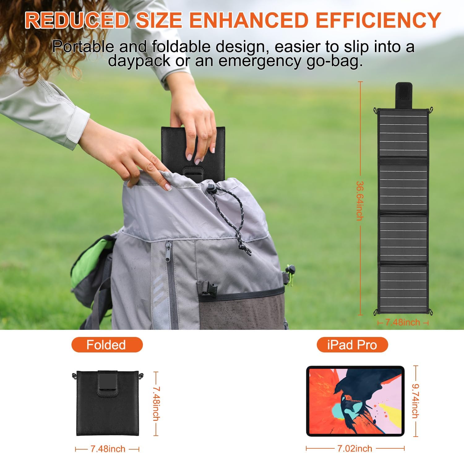 Portable Camping Solar Charger: With a folded size of 7.4× 7×1.4in and a lightweight (1.2 lbs) design, it is compact and light enough to fit into any camping backpack or hiking daypack. It is also a must-have for stashing in an emergency kit. Solar phone charger is a great option if you’re taking an extended camping trip or traveling somewhere with an unreliable power grid