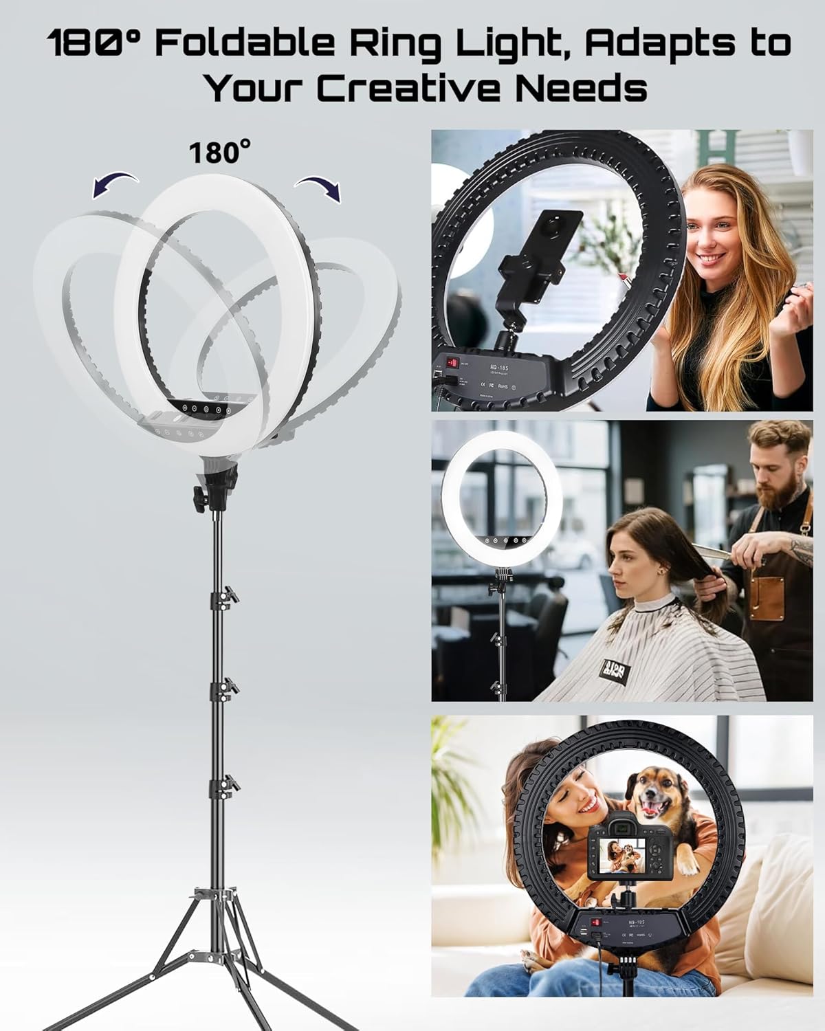 Professional 18-Inch Ring Light with Adjustable Brightness & Color Temperature – Features 120 high-performance LED beads (RA>95) delivering 55W of flicker-free, perfect for makeup artists, YouTubers, and photographers. Easily adjust brightness (10%-100%) and color temp (3000K-6000K) via touch control or included remote