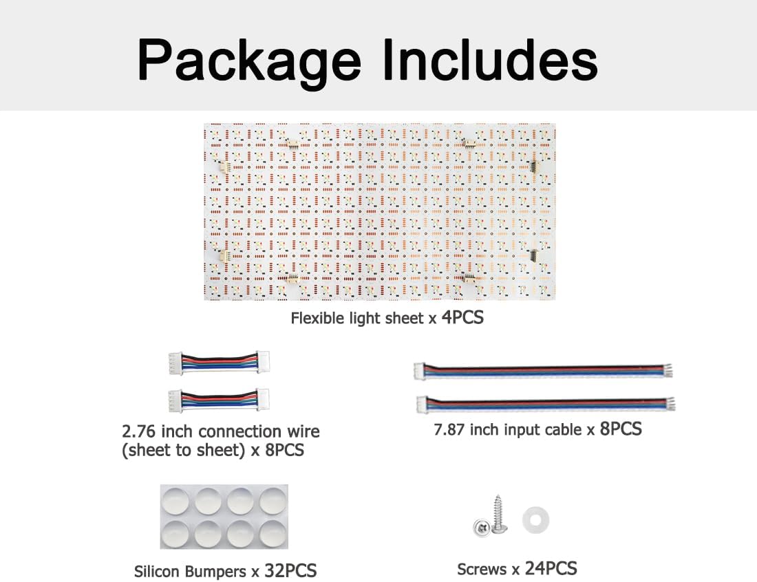 Durable & Complete Kit: Copper-plated PCB ensures low voltage drop and excellent heat dissipation. Rated lifespan 50,000 hours, indoor IP20, operating temp -4 ~ 113 °F. Package includes 4 panels, 8 connection cables, 8 input wires, 32 silicone bumpers, and screws. Backed by a 3-year warranty.
