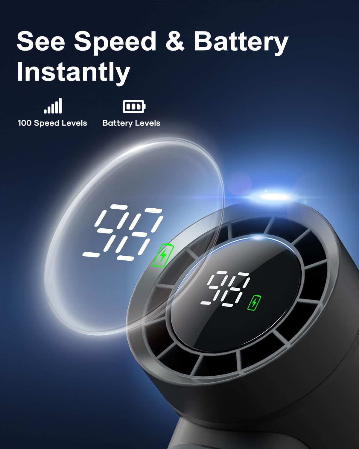 Digital LED Display – Monitor exact battery percentage and speed level of your hand fan at a glance for ultimate control and convenience.