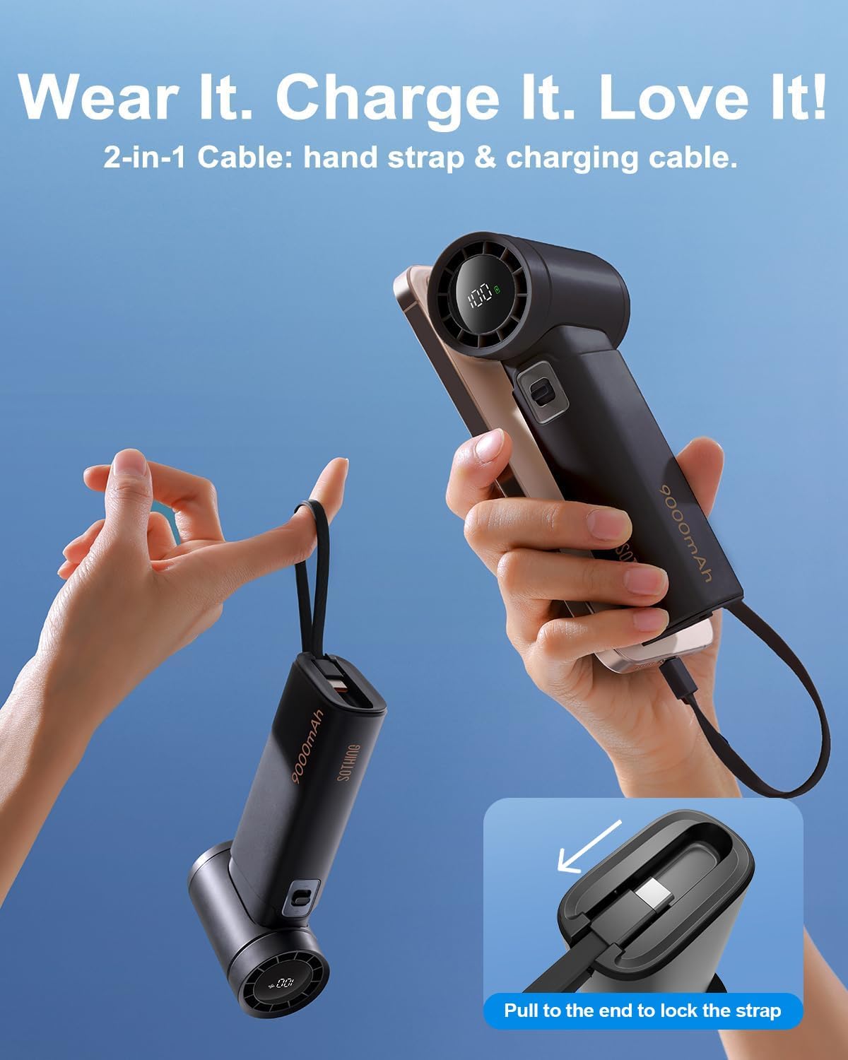 Multifunction Lanyard Cable – The included charging cord also functions as a hand strap—adding to the versatility of this hand held fan.
