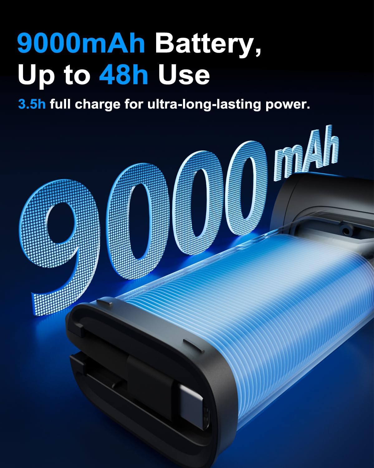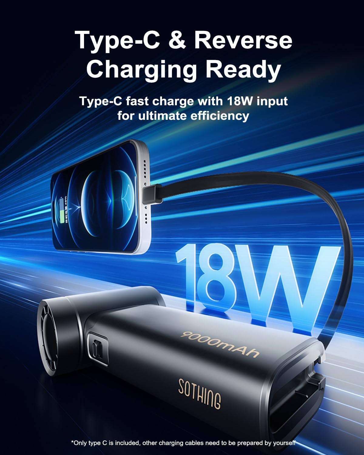 18W Type-C Fast Charging – Get 60% charge in just 30 minutes with the portable fan with charger power bank feature, and enjoy full power in only 3.5 hours. A Type-C port allows reverse charging for your phone, making it ideal for outdoor camping use.