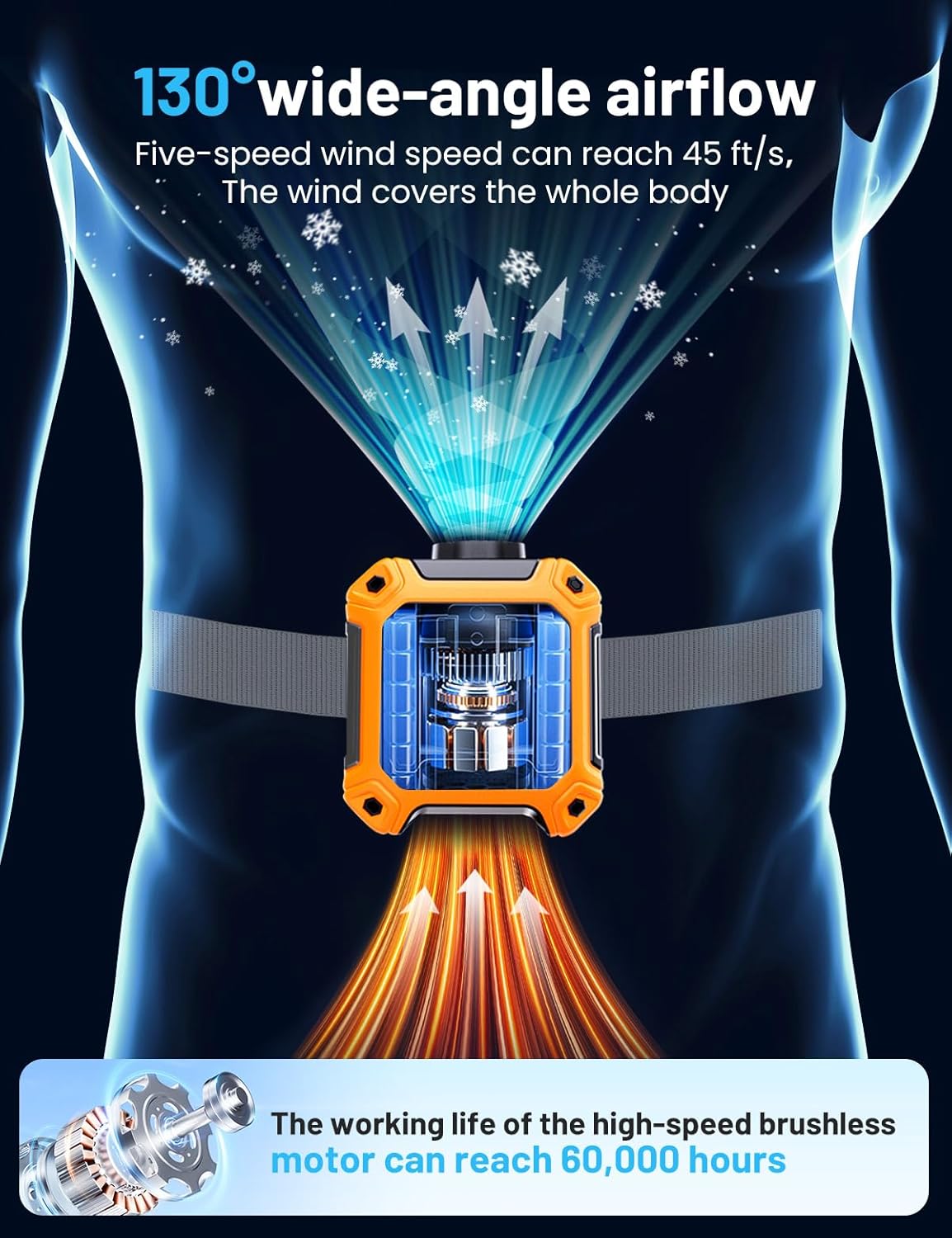 【Adjustable, Powerful Airflow】Featuring a high-speed brushless motor that reaches up to 16,000 RPM, this fan delivers a strong and instantaneous cooling effect. With five adjustable wind settings ranging from a natural breeze to a powerful gust, you can customize your comfort for any situation. Enjoy maximum wind speed for intensive cooling up to 8 hours or opt for a gentle airflow that lasts up to 40 hours.