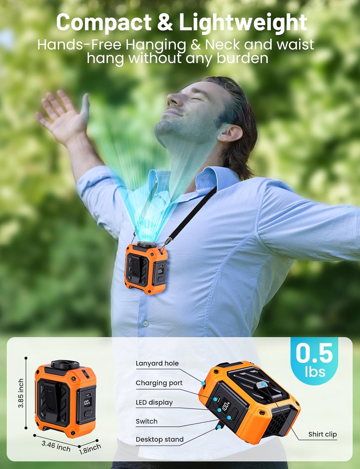 【5-in-1 Multifunctional Design】Experience versatility at its best: clip it to your waist, wear it as a neck fan, place it on your desk, or even use it as an emergency power bank to charge your phone. The integrated LED light not only illuminates your surroundings but also features a built-in SOS function to enhance your safety during emergencies.