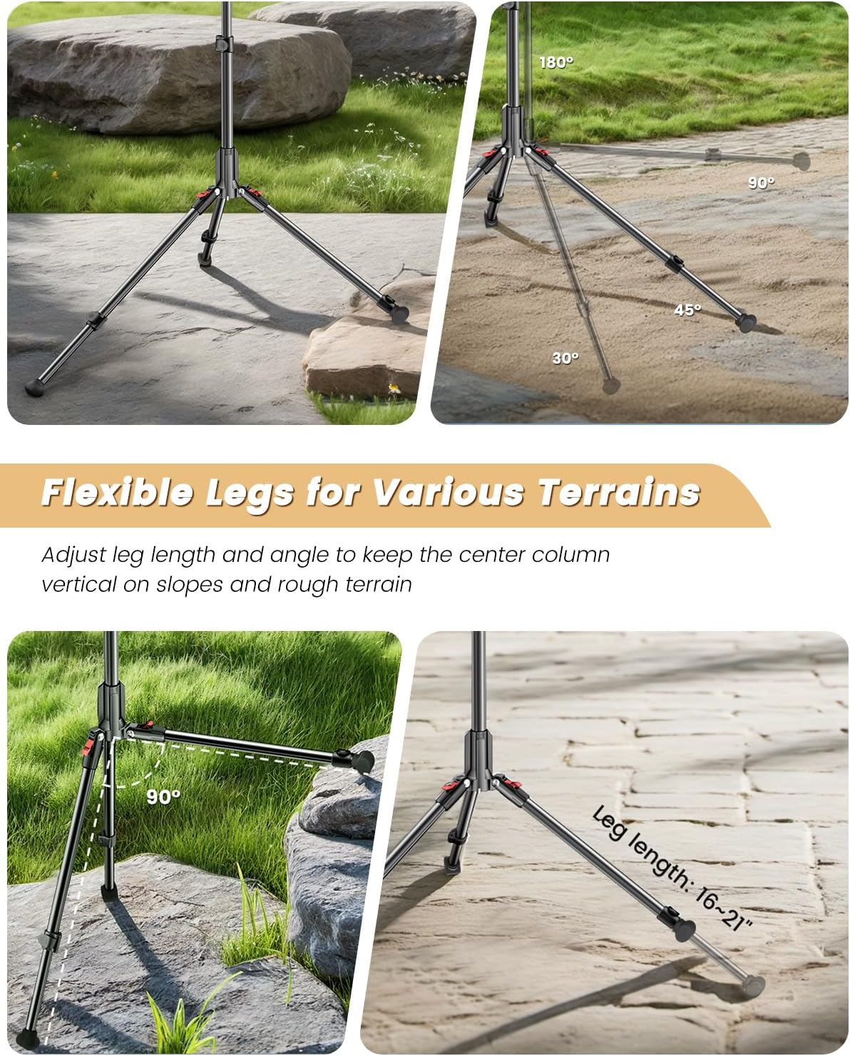 【Superior Stability】The extendable base diameter (up to 3.7 feet) significantly lowers the center of gravity. Aluminum two-section telescopic legs with adjustable angles and lengths. The tripod stays upright even on sloped or uneven terrain.The included counterweight hook ensures shake-free performance even in windy conditions.